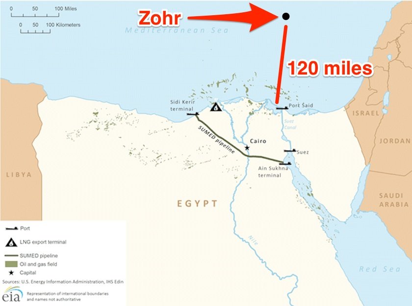 A natural gas discovery could hold a potential of 30 trillion cubic feet of lean gas in place (5.5 billion barrels of oil equivalent in place) covering an area of about 100 square kilometres. It’s the largest gas discovery ever made in Egypt and in the Mediterranean Sea and could become one of the world’s largest natural-gas finds. This exploration success, after its full development, will be able to ensure satisfying Egypt’s natural gas demand for decades.