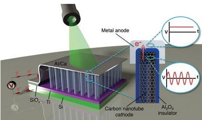 “Our process uses three simple steps: grow a large array of nanotube bundles vertically; coat one end with dielectric; then deposit another layer of metal,” Cola told EE Times. “In effect we are using one end of the nanotube as a part of a super-fast metal-insulator-metal tunnel diode, making mass production potentially very inexpensive up to 10-times cheaper than crystalline silicon cells.”