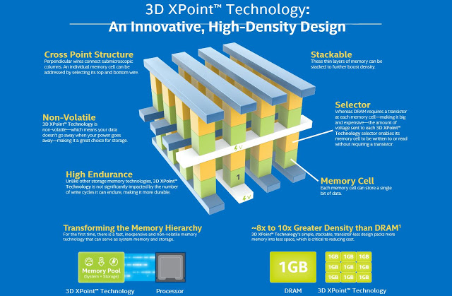 3D Xpoint has 128 gigabit array memory chips which is non-volatile (does not electricity to retain memory) and has 10s nanosecond read latency.
