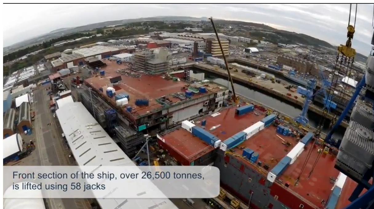 More than 26,500 tonnes of the forward half of the ship were mechanically skidded back 17 metres to join on to the 12,000-tonne “superblock” which makes up the rear of the vessel.
