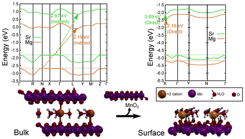 We show a comprehensive study on the structure and electronic properties of a layered manganese oxide commonly known as birnessite. We present the effects of substituting different intercalated cations (Li+, Na+, K+, Be2+, Mg2+, Ca2+, Sr2+, Zn2+, B3+, Al3+, Ga3+, Sc3+, and Y3+) and the role of waters in the intercalated layer. The importance of the Jahn–Teller effect and ordering of the Mn3+ centers due to cation intercalation are addressed to explain the ability to tune the indirect band gap (Egi) from 2.63 to ∼2.20 eV and the direct band gap (Egd) from 3.09 to ∼2.50 eV. By aligning the structures’ bands, we noted that structures with Sr, Ca, B, and Al have potential for usage in water splitting, and anhydrous B-birnessite is predicted to have a suitable direct band gap for light capturing. Furthermore, we also demonstrate how the effects of cations in the bulk differ from the behavior on single layer surfaces. More specifically, we show that an indirect to direct band transition is observed when we separate the bulk into a single layer oxide. This study shows a new strategy for tuning the band gap of layered materials to capture light which may couple to its intrinsic water-splitting catalytic properties, thus resembling photosynthesis.