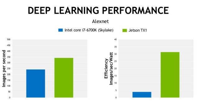 Nvidia is hoping to attract machine learning developers with the Jetson TX1, an ARM-based development board powered by the top-end Tegra X1 SoC. The company claims that in certain deep learning tasks that rely on dynamic input and computations—autonomous drones, facial recognition and behavioural analysis, and computer vision—the Jetson TX1 will beat out an Intel Core i7 6700K Skylake CPU in performance.