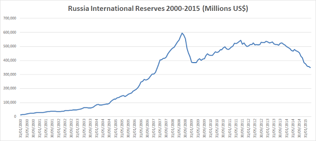 Alongside the drop in international reserves, other indicators of Russia’s slump included a 10 percent reduction in retail sales while inflation hovered around 16 percent.