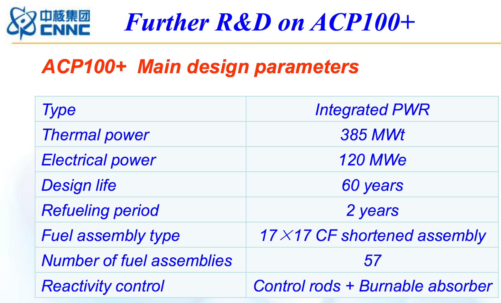 ACP100 preliminary design was completed in 2014. It should start construction in 2015 and start operation in 2017. The design is based on the larger ACP (and CNP) units, or AP1000, has passive safety features and will normally be installed underground. Seismic tolerance is 300 Gal. It has 57 fuel assemblies 2.15m tall and integral steam generators (287ºC), so that the whole steam supply system is produced and shipped as a single reactor module. It has passive cooling for decay heat removal.