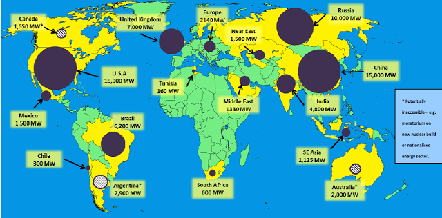 The market study concludes that there is a very significant market for SMRs where they fulfil a market need that cannot, in all circumstances, be met by large nuclear plants. The size of the potential SMR market, is calculated to be approximately 65-85GW by 2035 (as shown above), valued at £250-£400bn, if the economics are competitive. In a regional assessment, the study also determines that there could be a UK market for around 7GW of power from SMRs by 2035, based on a demand for low-carbon generation and site availability for small nuclear reactors (less than 300MW). To gain access to larger potential markets for SMRs, it would be