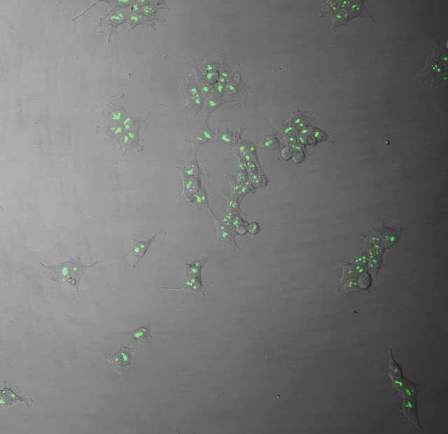 Cultured cells with the foreign fluorescent protein gene inserted using the PITCh system. Green spots observed in cells indicate successful insertion of the foreign fluorescent protein gene by the PITCh system. Credit- Hiroshima University