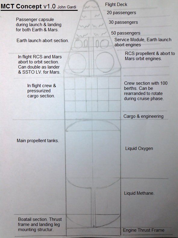A rough speculation system design from John Gardi is to estimate a Mars Colonization transport that is twice as tall as a Saturn V. So MCT would be 500 feet tall. It would have three decks for the 100 colonists.