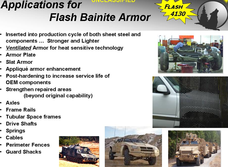 Ohio State University engineers verified the claims of increase the strength of steel by seven percent and can make cars and other products 30% lighter while keeping the same strength. For armor it can provide the equal of the best protection with a 20% weight reduction.