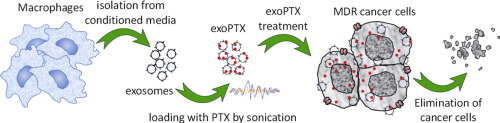 Exosomes have recently come into focus as “natural nanoparticles” for use as drug delivery vehicles. Our objective was to assess the feasibility of an exosome-based drug delivery platform for a potent chemotherapeutic agent, paclitaxel (PTX), to treat MDR cancer. Herein, we developed and compared different methods of loading exosomes released by macrophages with PTX (exoPTX), and characterized their size, stability, drug release, and in vitro antitumor efficacy. Reformation of the exosomal membrane upon sonication resulted in high loading efficiency and sustained drug release. Importantly, incorporation of PTX into exosomes increased cytotoxicity more than 50 times in drug resistant MDCKMDR1 (Pgp+) cells. Next, our studies demonstrated a nearly complete co-localization of airway-delivered exosomes with cancer cells in a model of murine Lewis lung carcinoma pulmonary metastases, and a potent anticancer effect in this mouse model. We conclude that exoPTX holds significant potential for the delivery of various chemotherapeutics to treat drug resistant cancers.