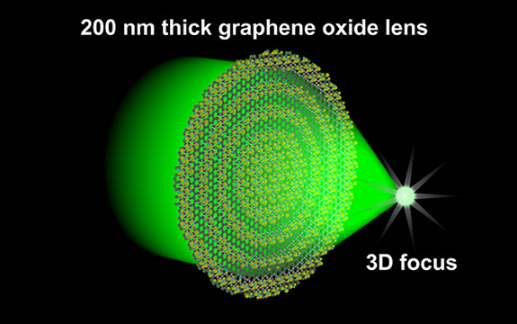 Just over two years ago, PhD student at Swinburne’s Centre for Micro-Photonics, Xiaorui Zheng, tried fashioning a lens using graphene oxide — a variation of the super-strong, atom-thick carbon material, graphene. The team, led by Associate Professor Baohua Jia, developed a three-dimensional printer that could quickly and cheaply produce the lens using a sprayable graphene oxide solution. Lasers were used to precisely pattern the surface, creating three concentric rings of reduced graphene oxide, which enabled its extraordinary focus.