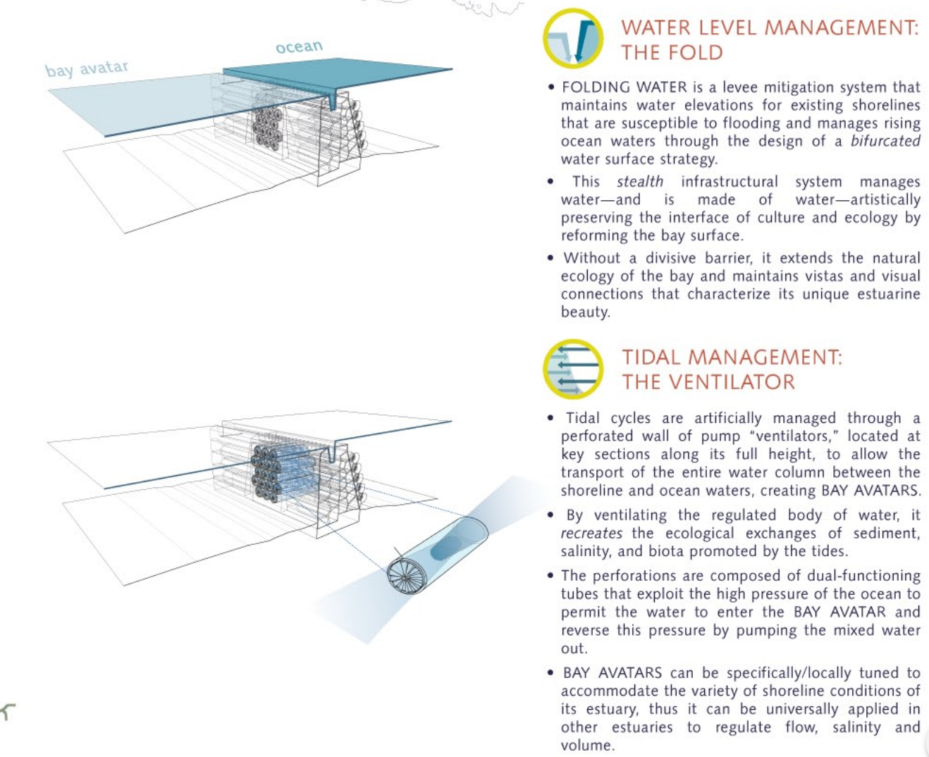 A system of “pump ventilators” would be built into the walls, returning excess water to the sea while mimicking the effects of tidal exchange. Natural pressure would force ocean waters and small sea life into the estuary through one side of these tubes, while the mixed water would be pumped back out the other side.