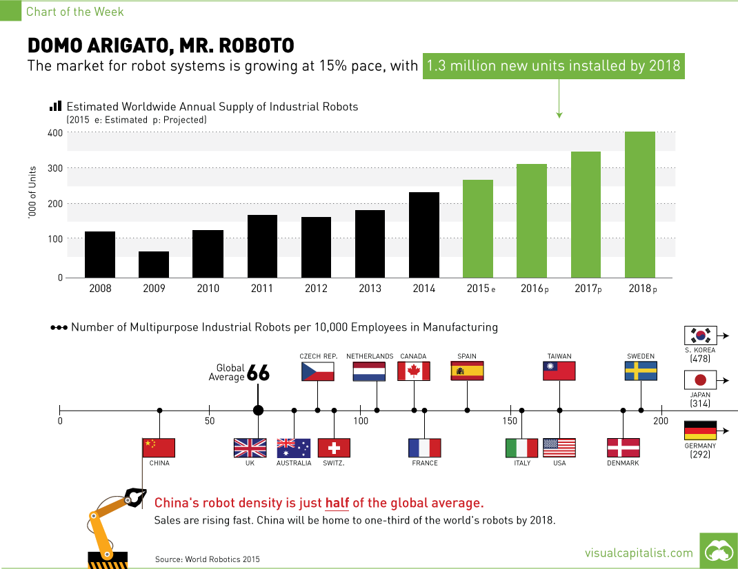 Since 2010, the demand for industrial robots has accelerated considerably due to the ongoing trend toward automation and the continued innovative technical improvements of industrial robots. Between 2010 and 2014, the average robot sales increase was at 17% per year (CAGR). The number of robot installations had never increased so heavily before. Between 2005 and 2008, the average annual number of robots sold was about 115,000 units. Between 2010 and 2014, the number rose to about 171,000 units. This is an increase of about 48% and a clear sign of the significant rise in demand for industrial robots worldwide.