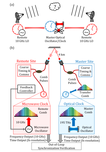 (a) Conceptual multistatic synthetic aperture radar where an array of microwave oscillators are synchronized to a single master optical oscillator; LO, local oscillator. (b) The master site’s clock is based on a laser stabilized to an optical cavity (optical oscillator). The remote site’s clock is based on a combined quartz oscillator and DRO. This remote microwave clock is tightly synchronized to the optical clock over a folded 4 km long air path via O-TWTFT. The time and the frequency outputs from each clock are compared in a separate measurement to verify femtosecond time offsets and high phase coherence of the synchronized signals