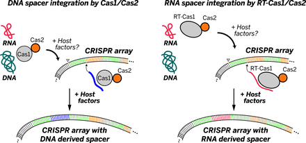 The CRISPR/Cas system works by snipping short DNA elements from the genomes of infecting viruses, integrating those elements into the bacterium’s genome (at the CRISPR locus), and using the RNAs produced from the integrated elements to direct destruction of the corresponding virus. In essence, the bacterium keeps a DNA account of its viral foes, and uses it against them.