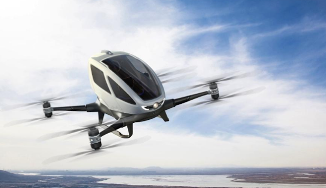 The EHang 184 pilotless passenger drone carries a single person and has been approved for testing this year in the US.