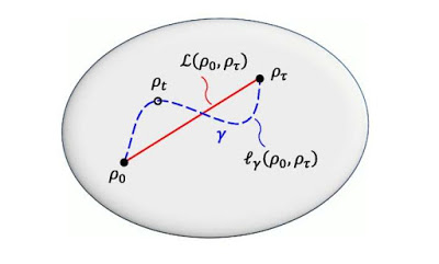 Illustration of geometric quantum speed limits. The ultimate speed limit arises from the length of the shortest geodesic path between two states, which here is the dashed blue curve.