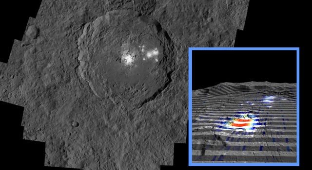 The center of Ceres’ mysterious Occator Crater is the brightest area on the dwarf planet. The inset perspective view is overlaid with data concerning the composition of this feature: Red signifies a high abundance of carbonates, while gray indicates a low carbonate abundance.