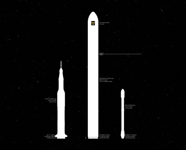 Early plans for the MCT launch vehicle, made public in April 2014, consisted of one or three cores with a 10-meter (33 ft) diameter which is comparable to the Saturn V. At the time, the rocket was slated to use nine Raptor LOX/methane engines to power each core. The possibility of eliminating any tri-core version design, and modifying the MCT launch vehicle design to a single-core but larger-diameter vehicle—12.5 to 15 meters (41 to 49 ft) core diameter—was raised in late 2014 and further confirmed by Musk in early 2015.
