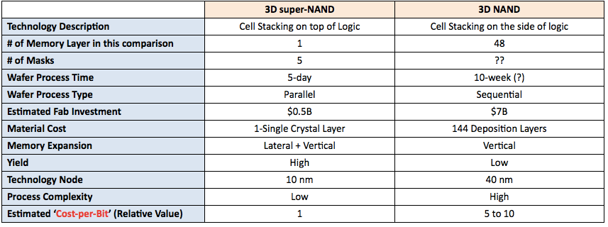 “With just five masks, we can process our 3D NAND with three-times the capacity of SanDisk’s or Samsung’s designs in just five days processing, whereas it takes them as much as 10 weeks to process their 3D NAND chips,” said Lee. “The capital equipment we need also costs as much as 10-times less than theirs.”