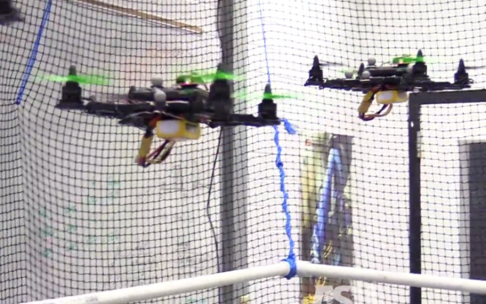 A wireless system sends the thought to the robots. “We have a motion-capture system that knows where the quads are, and we change their distance, and that’s it,” he said.