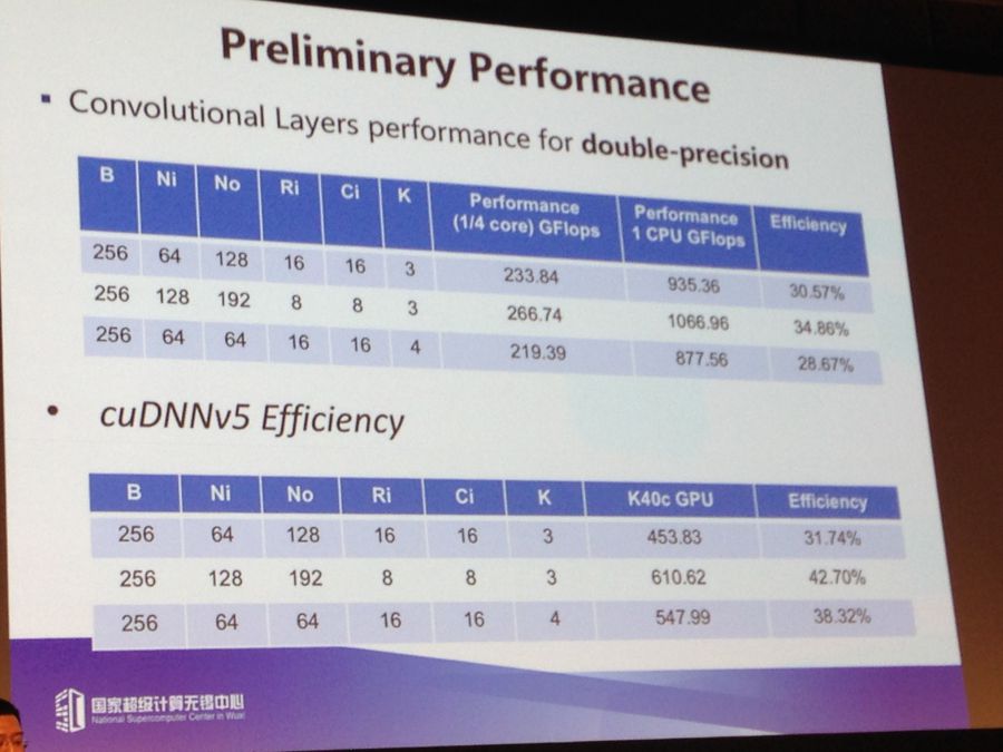 Above are some noteworthy preliminary performance results for convolutional layers for double-precision. The efficiency isn’t outstanding (around 30%A) but Fu says they’re working on the library to bolster it and get equal or better performance than the GPU—the standard thus far for training.