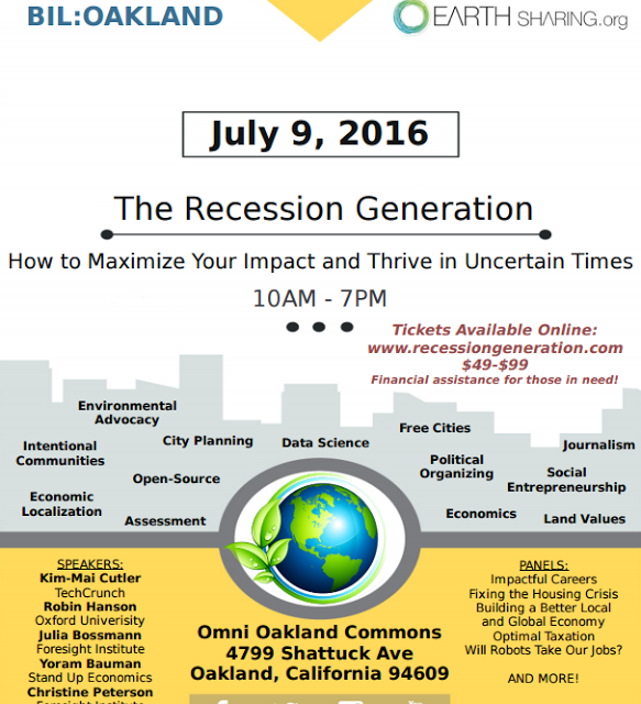 On Saturday, July 9, 2016 BIL Conference and Earthsharing.org are hosting an event in Oakland, “The Recession Generation: How to Maximize Your Impact and Thrive in Uncertain Times.” The event aims to help the millennial generation navigate the uncertainties of economic life through networking, skill-sharing sessions, and a number of talks that address the causes and solutions to economic inequality and other large problems.