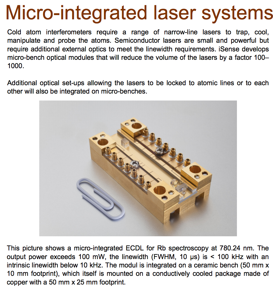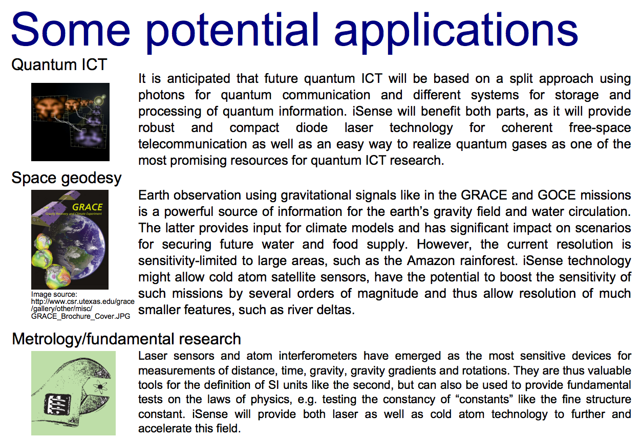 The iSense project aims to bring the latest developments in ultracold atom science to practical applications by developing the technology that will turn laboratory-based instrumentation into portable and robust instruments and sensors. One most attractive application of such instruments would be to create a very compact, highly sensitive gravimeter, which is one long term goal of the Project.