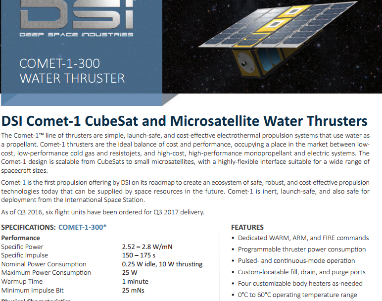 The DSI Comet-1™ electrothermal thruster uses the most abundant resource in the solar system—water—as propellant. It is intrinsically inert, launch safe, and cost-effective. This low-power, low-profile, high total impulse micropropulsion system is CubeSat-compatible but incorporates a highly-flexible interface suitable for a wide range of spacecraft sizes.