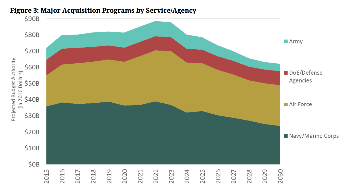 Several major programs dominate the US military budgets until 2030.