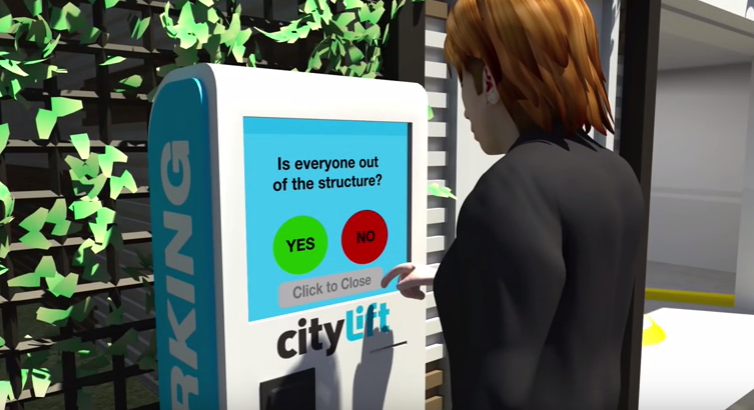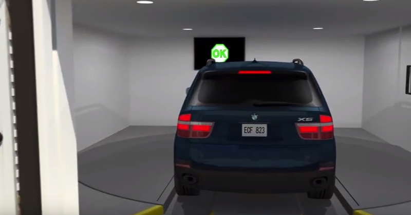 You drive the vehicle past a height sensor, then through a garage doorway and onto a platform—which itself is on what look like the tracks you’d find at an automatic carwash. Following instructions on a screen, you exit your vehicle and visit a kiosk to get a ticket that you use to retrieve the vehicle when you return. The system rotates the vehicle, loads it onto an elevator, and then stores it away on the appropriate shelf, potentially several stories up or down in a narrow-footprint building.