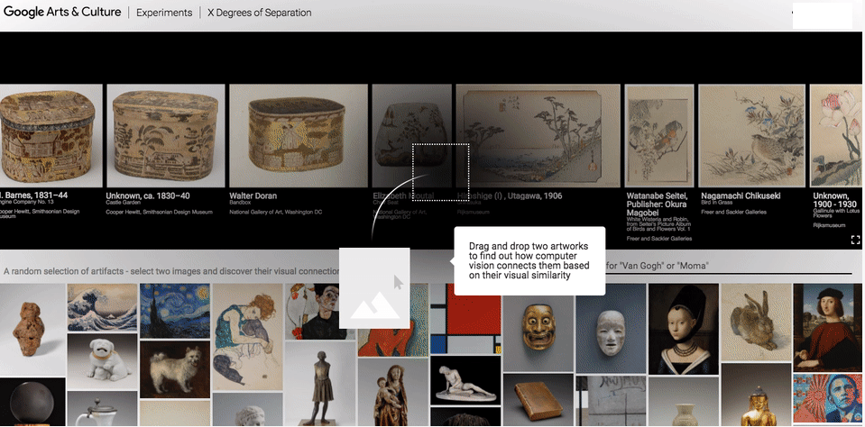 - X Degrees of separation: They say any two people in the world can be connected through just a few layers of friends of friends. Much like Kevin Bacon is connected to anyone in Hollywood. How about artworks? Created in collaboration with code artist Mario Klingemann, our ‘X Degrees of Separation’ lets you choose any two artworks and the computer using Machine Learning will find a visual pathway connecting them through a chain of similar artworks.