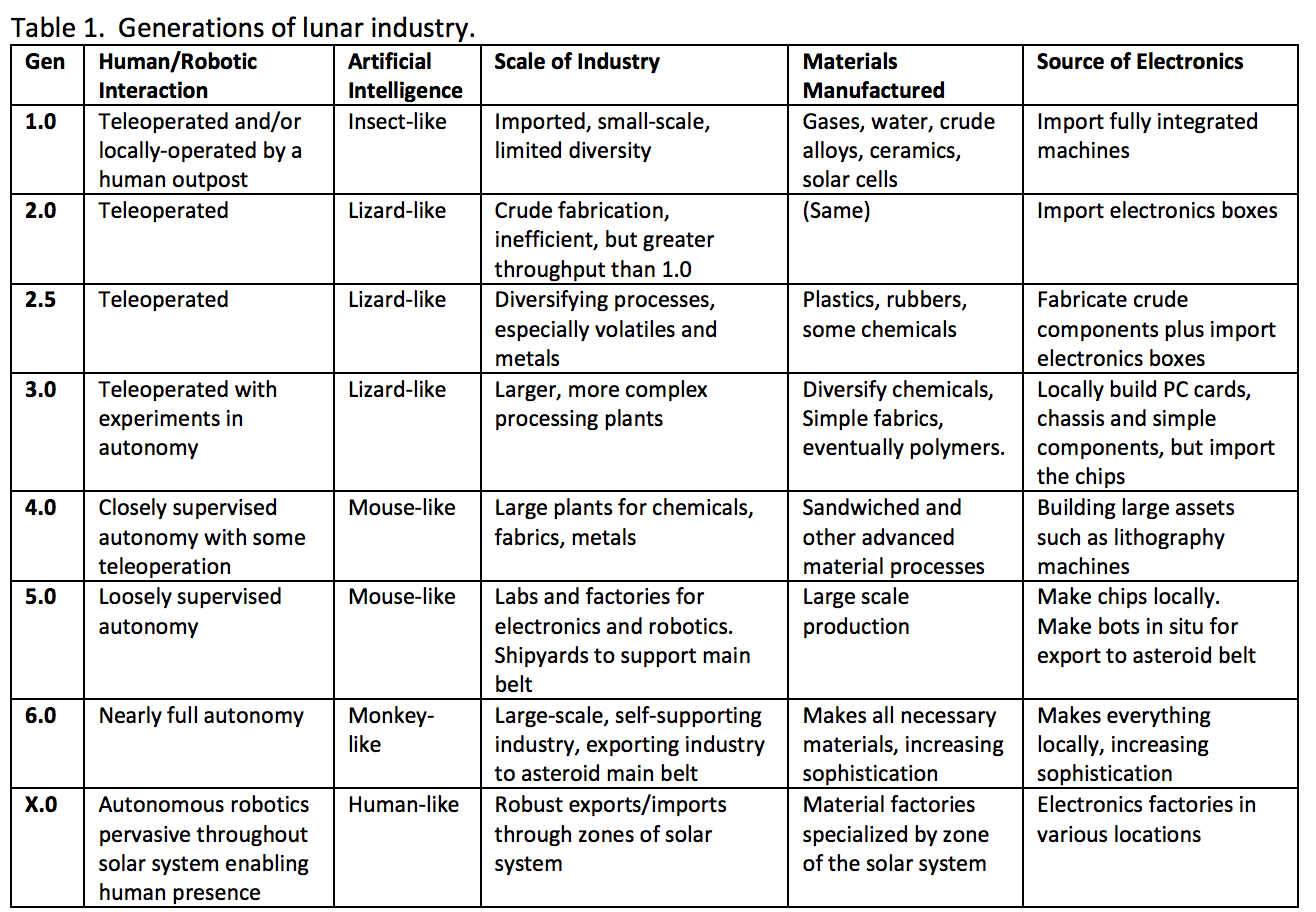 Once successfully bootstrapped, a robotic network can access, process, transport, and utilize the solar system’s resources for mankind’s benefit. Appropriately designed robots will not have the problems traveling the vast distances of the solar system that humans have, and they can set up the infrastructure that will enable us to follow. Within the first several decades a vital industry could be established on the Moon and in the asteroid belt using technologies that are for the most part only modestly advanced beyond today’s state-of-the-art. After that, human outposts, laboratories, and observatories can spring up everywhere between the Kuiper belt and Mercury. It can grow exponentially and provide mankind the ability to do things that today are only dreams. To make this possible very soon, the majority of technology advancement needs to occur in the automation of robotics and in additive manufacturing. Trends in these fields are hopeful, so they think the scenarios they present here are not too optimistic. Therefore, they think the space resource community has real reason to be motivated in its work. We are aiming for the possible, not the fantastical.