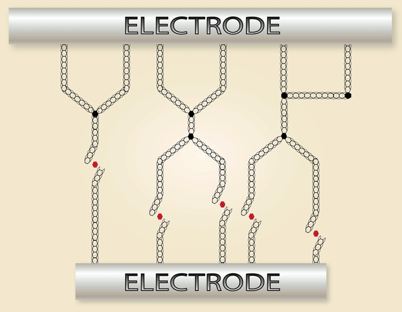 * hundreds of carbon nanotube connect each pair of electrodes.