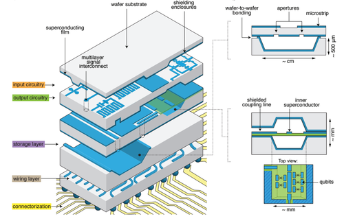 Multilayer microwave integrated quantum circuit (left) uses silicon wafers with features etched using MEMS techniques to create enclosures that serve as high-Q resonators as well as providing shielding. Superconducting metalization (blue) covers the walls of these enclosures to provide low-loss wafer-to-wafer bonding. A cross-section of the rectangular cavity resonator (upper right) shows interlayer aperture coupling between the cavity and transmission lines above. 3D superconducting transmission lines (lower right) could be constructed using membranes (green) in the MEMS structure where qubits and act as a compact low-loss quantum bus.