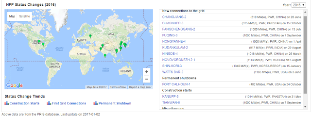 Ten new nuclear power reactors with a combined generating capacity of 9579 MWe came online in 2016.