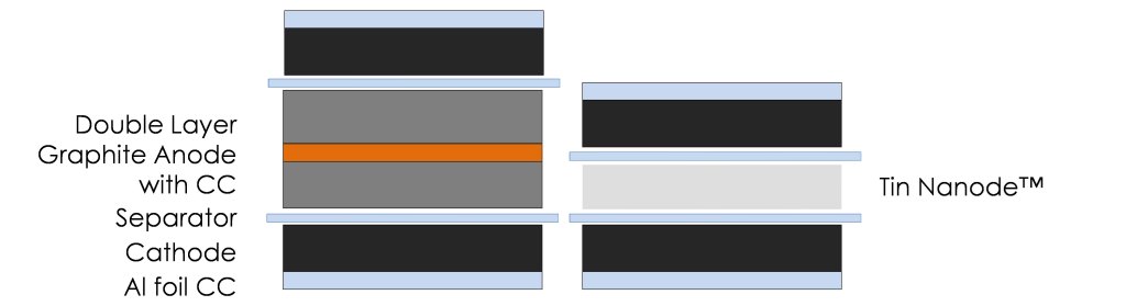 In a cell assembly, a single Tin Nanode™ can replace both sides of a conventional graphite anode, as well as the current collector foil. This is done by tailoring the active material loading to match the capacity of two cathodes while maintaining the thickness of the Tin Nanode™. In this way, the Tin Nanode™ is able to provide an advantage in volumetric and gravimetric energy densities.