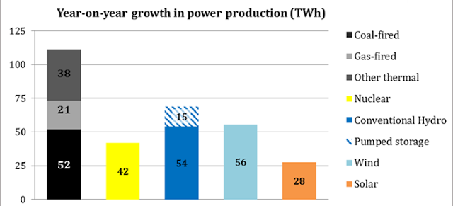 China added 5% more power generation in 2016. This was 240 TWh more to 5920 TWh. Almost half of this was coal or other fossil fuel power.