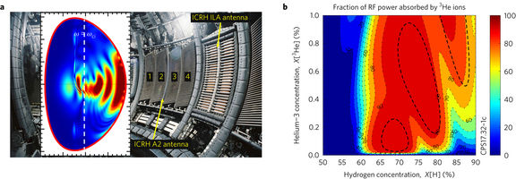 Researchers describe a new technique for the efficient generation of high-energy ions with electromagnetic ion cyclotron waves in multi-ion plasmas. The discussed ‘three-ion’ scenarios are especially suited for strong wave absorption by a very low number of resonant ions. To observe this effect, the plasma composition has to be properly adjusted, as prescribed by theory. We demonstrate the potential of the method on the world-largest plasma magnetic confinement device, JET (Joint European Torus, Culham, UK), and the high-magnetic-field tokamak Alcator C-Mod (Cambridge, USA). The obtained results demonstrate efficient acceleration of 3He ions to high energies in dedicated hydrogen–deuterium mixtures. Simultaneously, effective plasma heating is observed, as a result of the slowing-down of the fast 3He ions. The developed technique is not only limited to laboratory plasmas, but can also be applied to explain observations of energetic ions in space-plasma environments, in particular, 3He-rich solar flares.