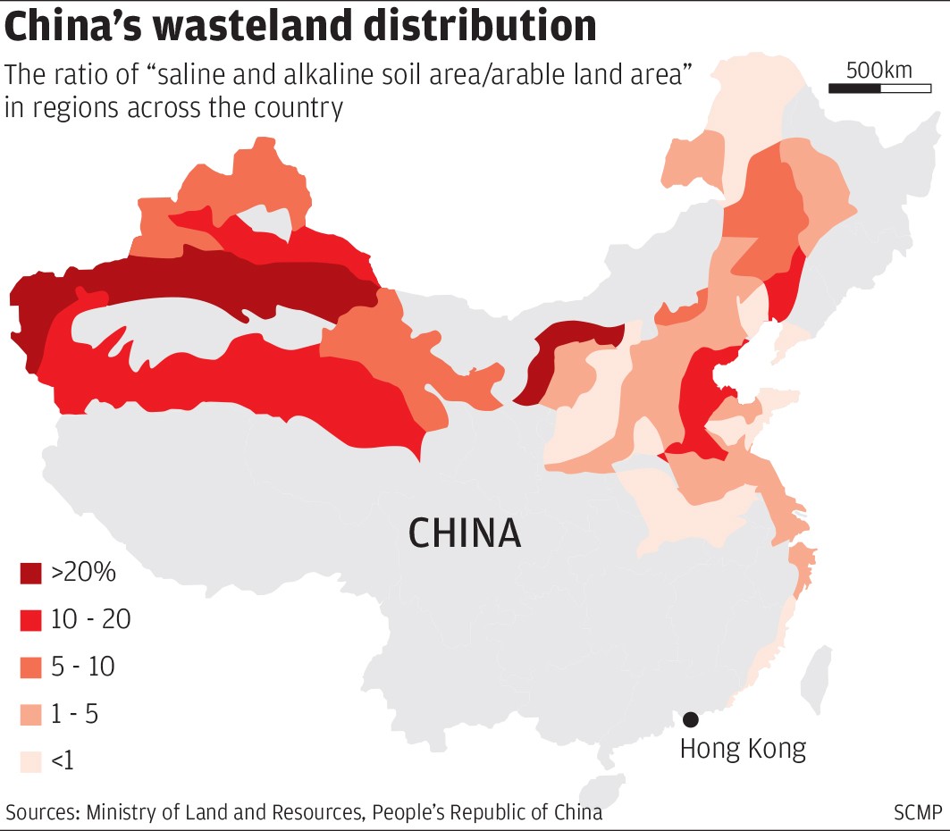 China has one million square kilometers of waste land, an area the size of Ethiopia, where plants struggle to grow because of high salinity or alkalinity levels in the soil.