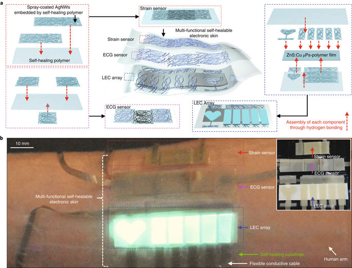 An integrated self-healable electronic skin system fabricated via dynamic reconstruction of a nanostructured conducting network.