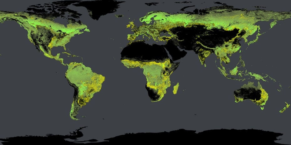 Above – Potentially possible tree density: Additional trees in yellow. (image: Crowther Lab / ETH Zurich)