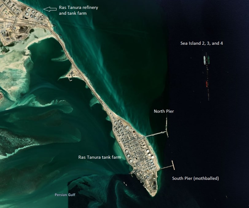 This is the Ras Tanura terminal, the world's largest oil export port. The key export facility is the so-called "Sea Island" (actually, 3 interconnected offshore platforms) where super-tankers dock. There are two large oil tank farms | #OOTT Map from @TheTerminal with my own notes pic.twitter.com/bNg20GGlot