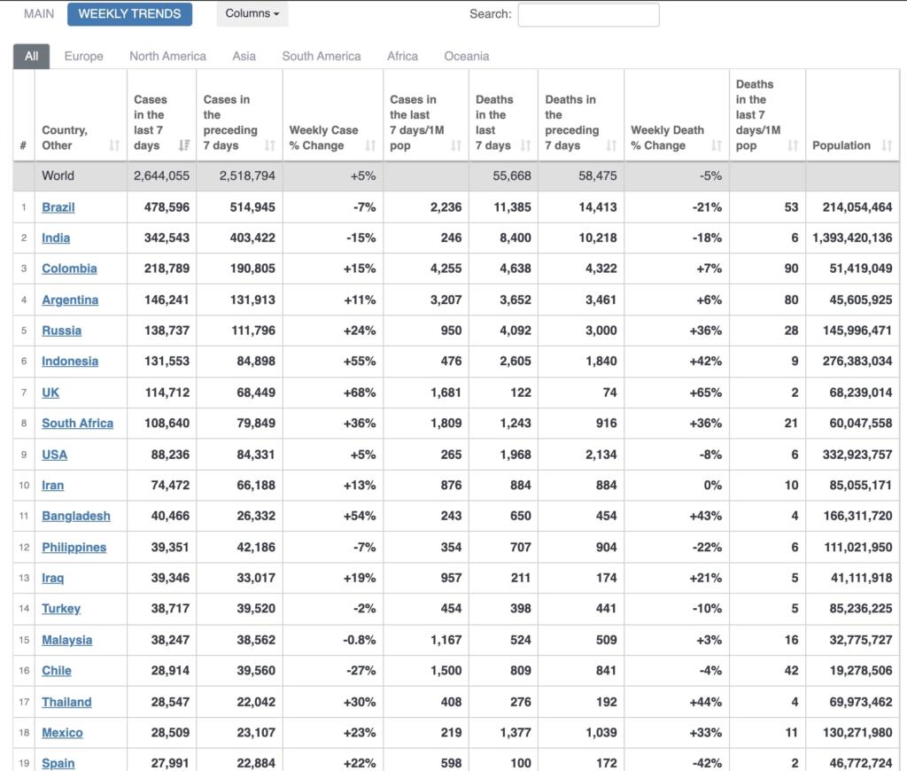 Brazil, India, Colombia and Argentina have the most COVID cases this week. Indonesia, Bangladesh, Pakistan will have a lot more cases in the coming weeks. Africa will also have a lot of cases but lack of testing will not show many of the cases in Africa.