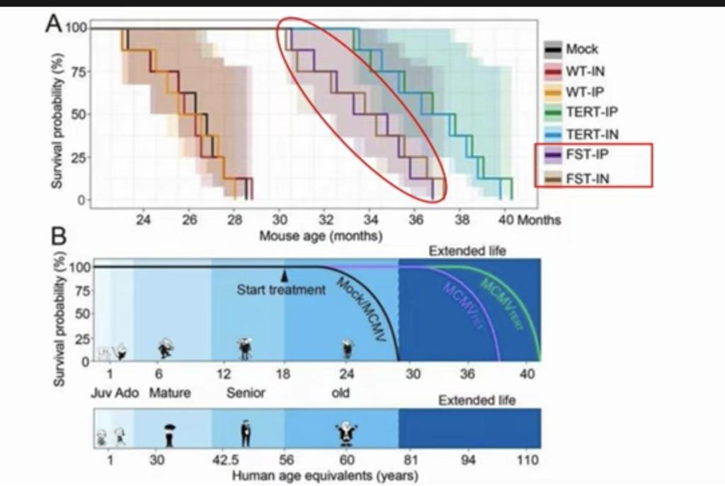 Antiaging gene therapies to overexpress TERT and Follistatin were used in a mouse model. The mice saw a 41 and 32% increase in median life span. The study also used a novel viral vector, cytomegalovirus for the delivery.