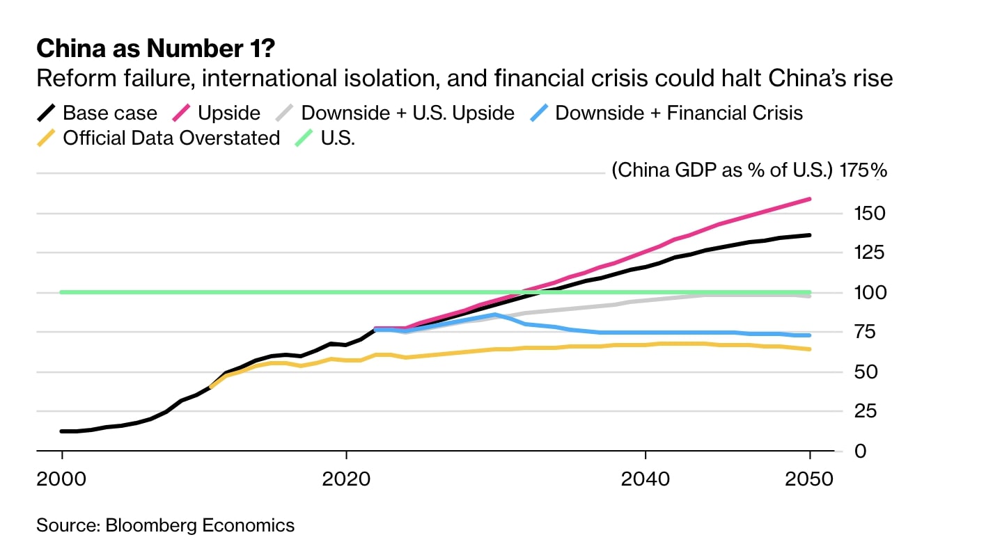 3. Bloomberg Economics has a combination US bull case and China bear case where US-China stay exactly matched through 2040-2050.