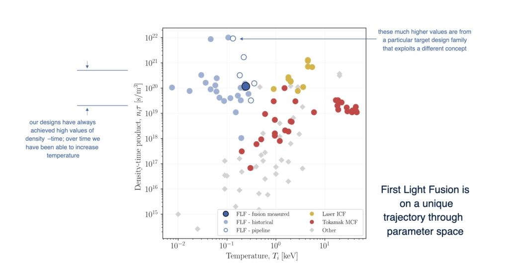 Comparing First Lught target design to other fusion approaches using the triple product shows the unique space that First Light occupies. The targets achieve very high values of the density-time product and span a previously unexplored parameter space. To reach gain, they need to increase the temperature, and the principal way to do this is to increase the projectile velocity.
