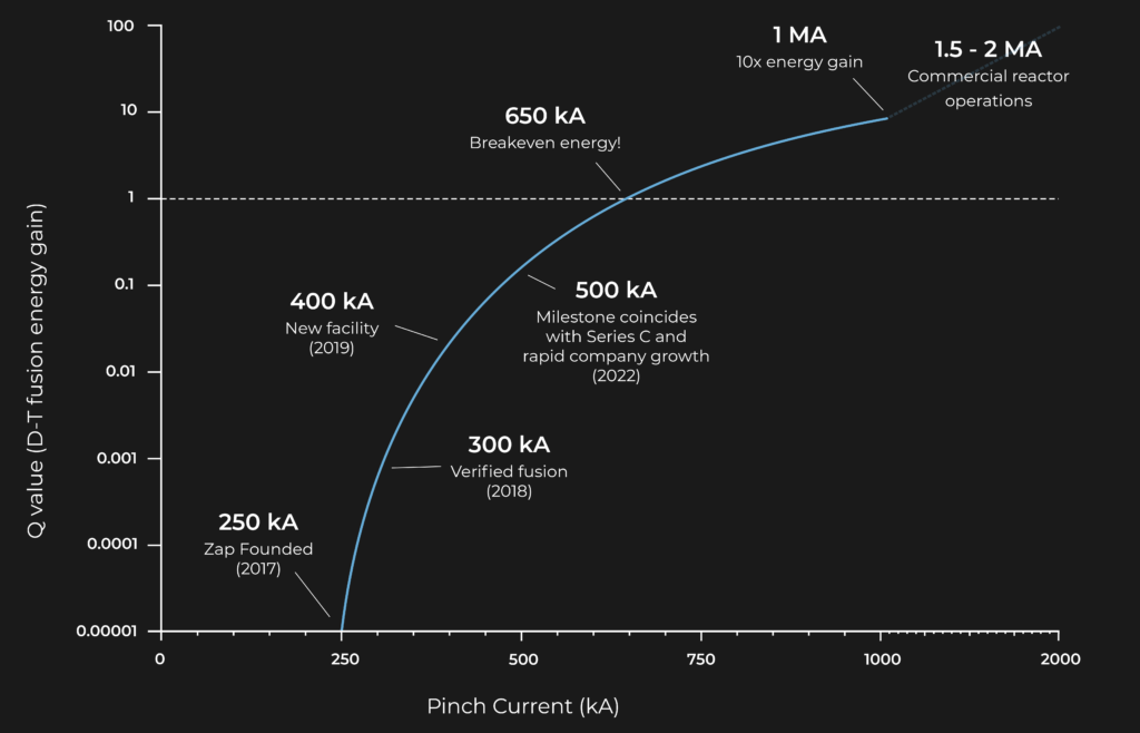 In 2021, Zap Energy used sheared-flow stabilization to extend the lifetime of Z-pinch plasmas at 500 kiloamps (kA) of current. Zap’s sheared-flow-stabilized Z-pinch technology might be a fast path to commercially viable fusion. It requires orders of magnitude less capital than traditional approaches. Zap Energy has over 60 employees based in Seattle, Everett and Mukilteo, Washington.