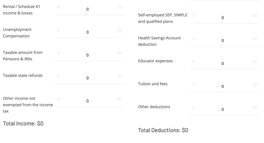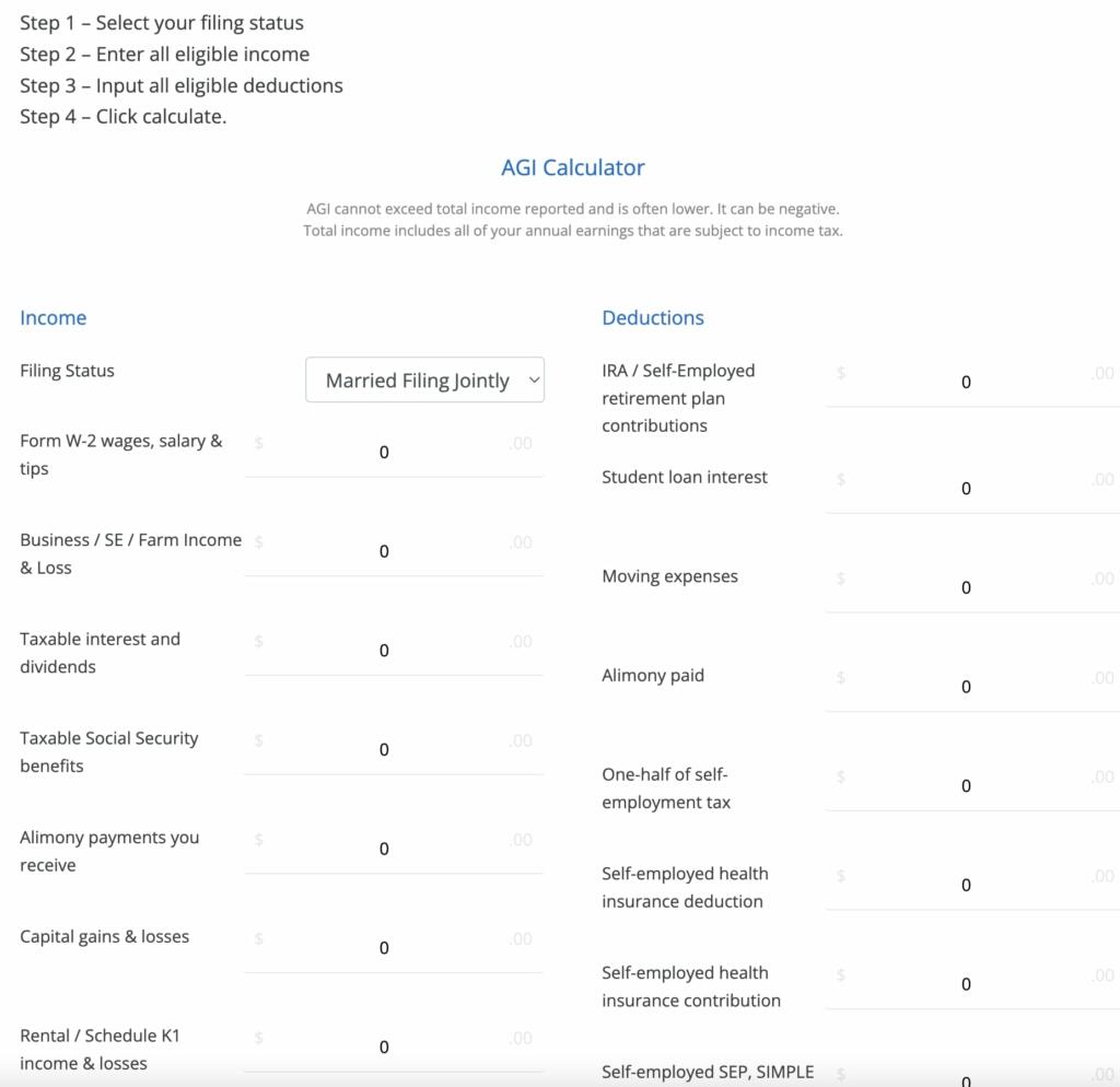 Using the income tax calculator, simply add all forms of income together, and subtract any tax deductions from that amount. Depending on your tax situation, your AGI can even be zero or negative.