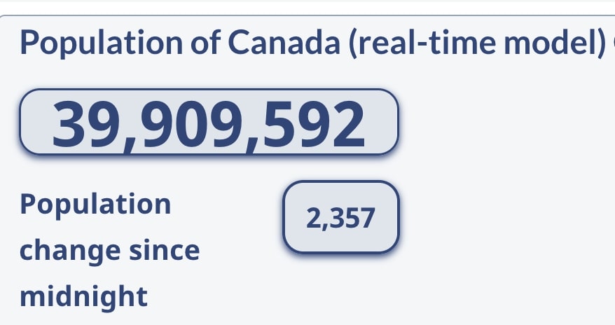 Canada’s real-time population on May 21, 2023 was 39.920 million people. This was a 40,000 person increase in 12 days.
