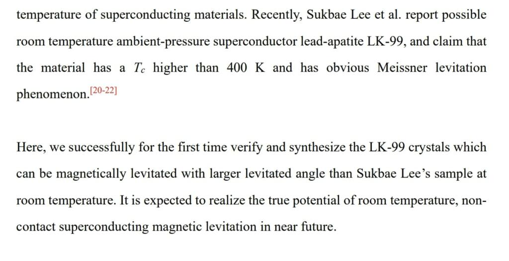 The chinese team from HUST has successfully for the first time verify and synthesize the LK-99 crystals which can be magnetically levitated with larger levitated angle than Sukbae Lee’s sample at room temperature. They state it is expected to realize the true potential of room temperature, noncontact superconducting magnetic levitation in near future.